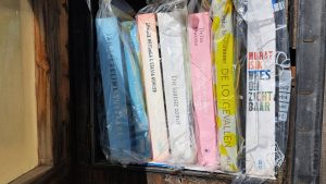 De collectie in haar bieb bestaat uit Nederlandstalige literatuur en daarin verschillende genres. Nathalie: “er zijn ook eens Duitstalige boeken in gekomen, maar die bleven staan en heb ik eruit gehaald. Ik houd wel in de gaten dat er een beetje een mix in staat en wissel soms wat om, zodat het blijft verrassen.” Nathalie heeft dus boeken uit haar eigen voorraad afgestaan, maar vertelt ook dat ze bepaalde favoriete boeken heeft die ze zelf houdt; als ze er ooit aan toekomt gaat ze die misschien nog eens lezen.